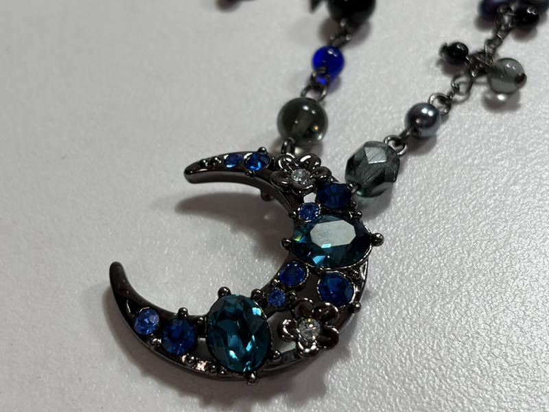 クレセントムーン(三日月)がトップにあしらわれた、色合い的にもとてもクールで洗練された印象のネックレスです。
