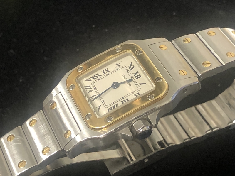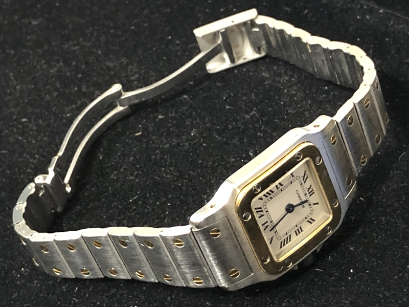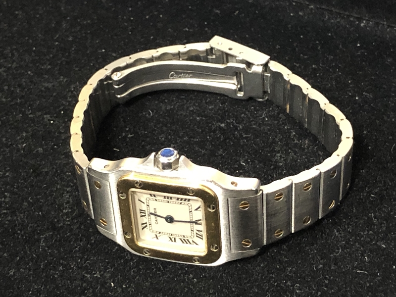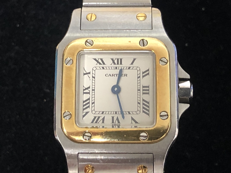 こちらのサントスはカルティエの定番モデルで、長きにわたり根強い人気があります。