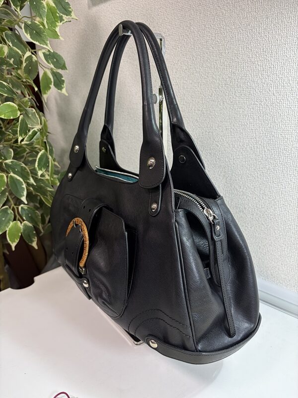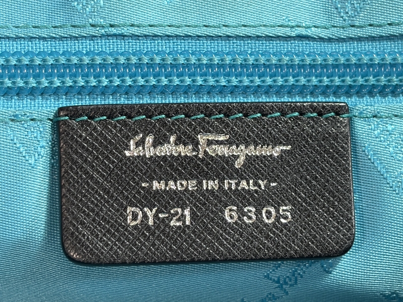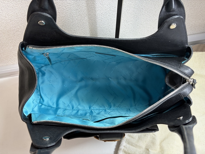 黒とスカイブルーのコントラストがとても綺麗な、フェラガモのハンドバッグです。