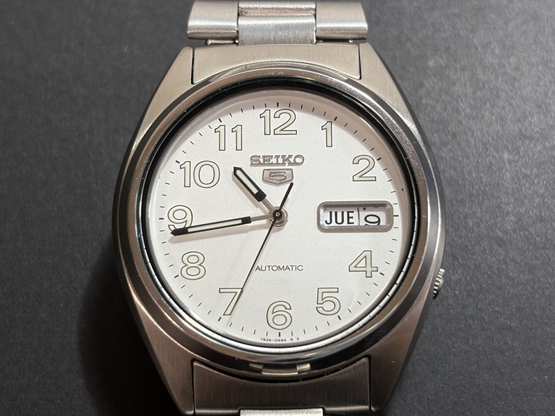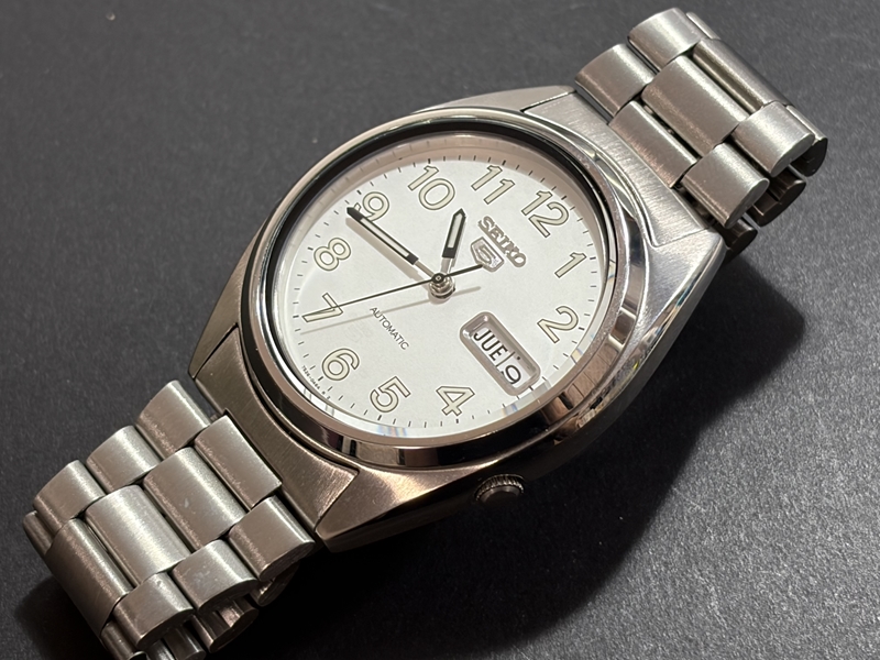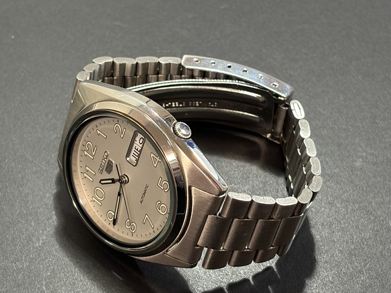 シンプルながら渋い、セイコー5の自動巻き腕時計です。