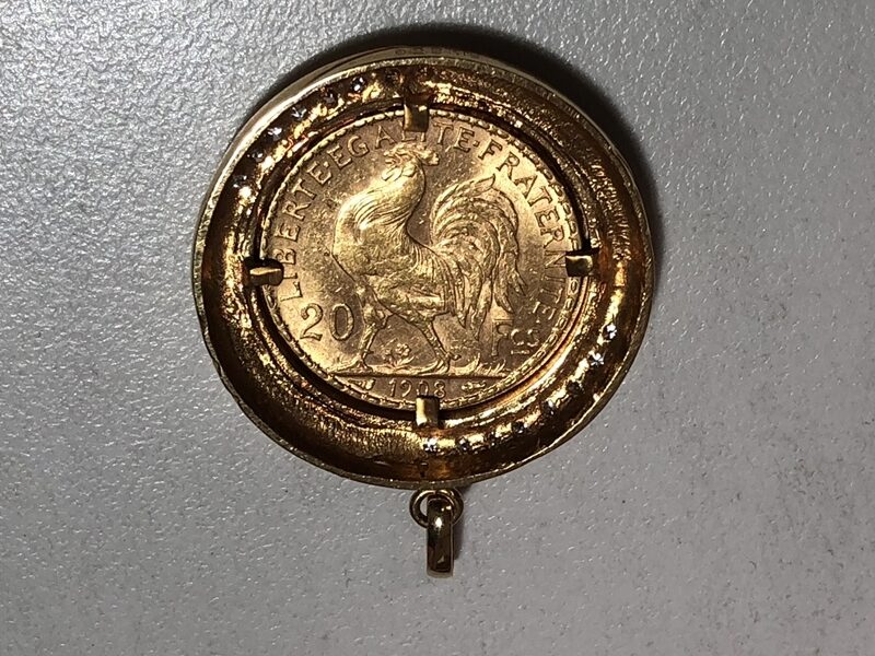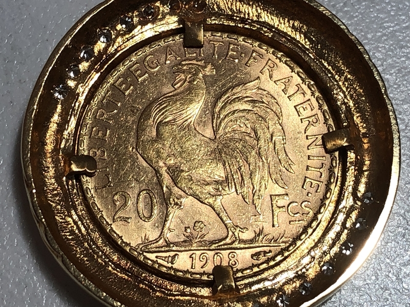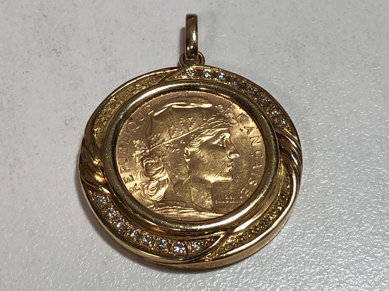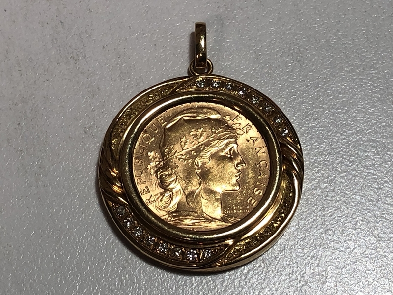 フランス ルースター金貨20フランK21.6+メレダイヤ付きK18枠 ペンダントトップ をお買取りさせていただきました!