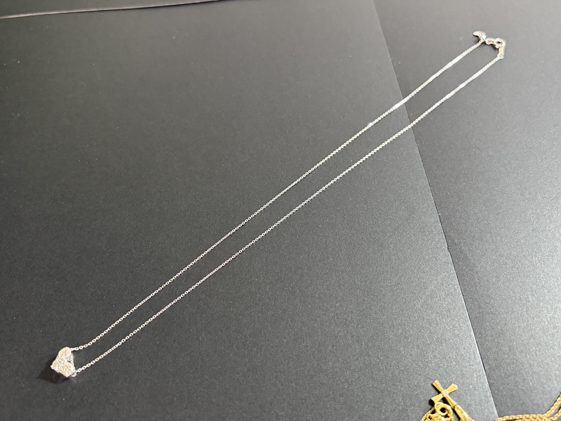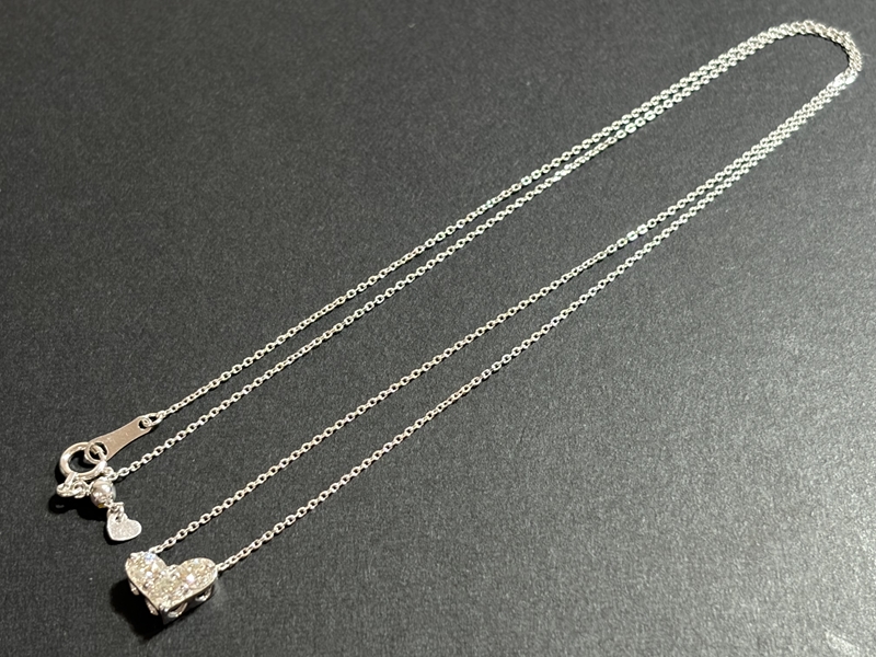 ダイヤモンドがあしらわれたハートのペンダントトップがとても素敵な、18金ホワイトゴールドのネックレスです。