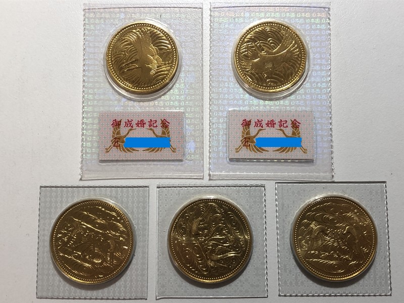 御在位60年記念10万円金貨x3、皇太子殿下御成婚記念5万円金貨x2
