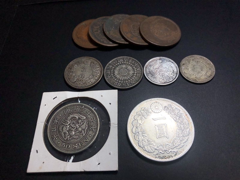 明治一圓銀貨、竜・旭日50銭銀貨、2銭銅貨一式 をまとめてお買取りさせていただきました!