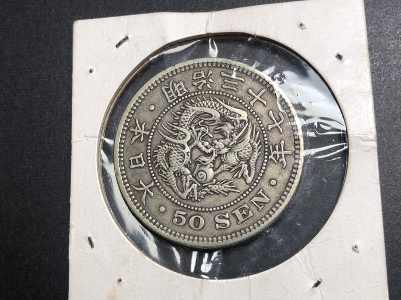 明治一圓銀貨、竜・旭日50銭銀貨、2銭銅貨一式